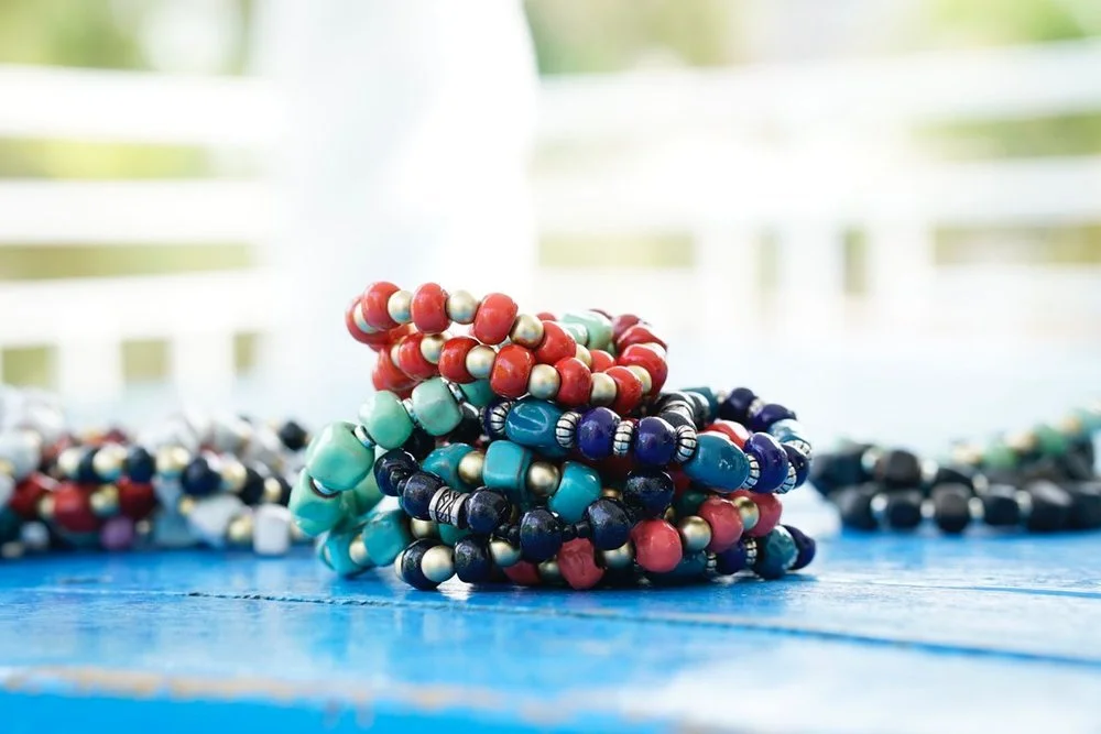 When you shop beaded bracelets these were designed and assembled by our employees using beads that are made and bought locally in Haiti.
